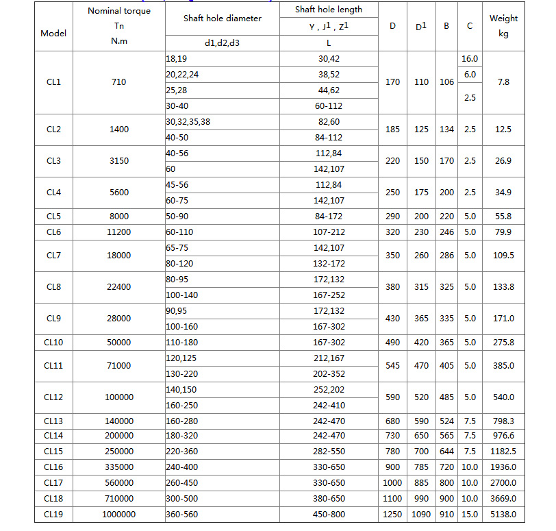 Features and applications: With a small amount of axis offset compensation performance, can not buffer, reduce vibration. The outer shape is small, theoretically, the transmission torque is large, and it needs lubrication and sealing, but the noise is large and the price is expensive, and it is used for connecting the horizontal two coaxial line shaft transmission. It is used to connect two horizontal coaxial lines under low speed and heavy load conditions, such as metallurgical machinery and heavy machinery. CL and CLZ type are spur gear type, which is used for low speed and heavy load. The two horizontal shafts are connected. The straight tooth type compensation performance is poor. It is a eliminated type and has been replaced by drum type gear. It should not be used again.