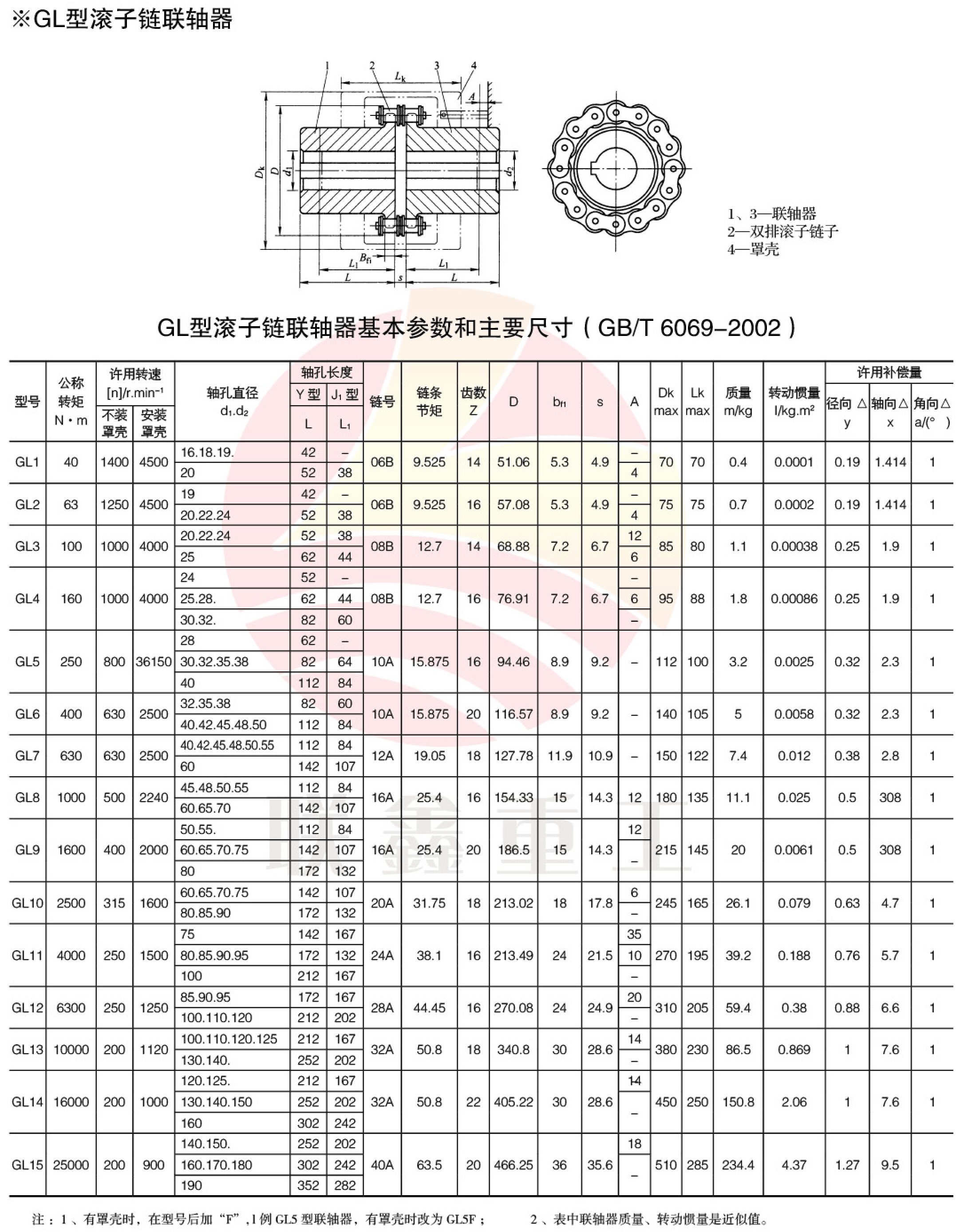 GL型滚子链联轴器 特点及应用场合:具有少量补偿两轴相对偏移的能力,结构简单,装拆方便,尺寸紧凑,质量轻,工作可靠,寿命长。可用于潮湿、多尘、高温、耐腐蚀工况环境。不适用于高速和较剧烈冲击载荷和扭振工况条件。不宜用于起动频繁、正反转多变的工作部位。![]() ![]() |