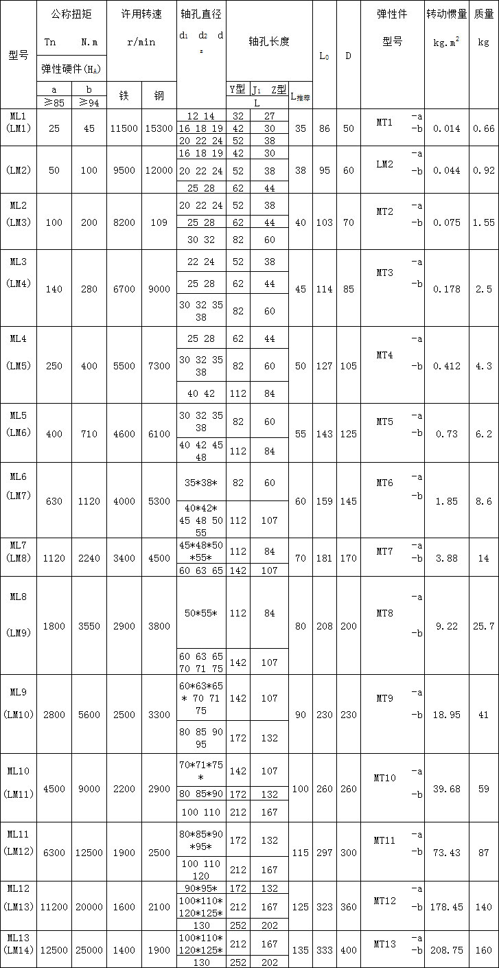 ML(LM)型梅花形弹性联轴器的参数及主要尺寸:(GB/T 5272-2002) mm