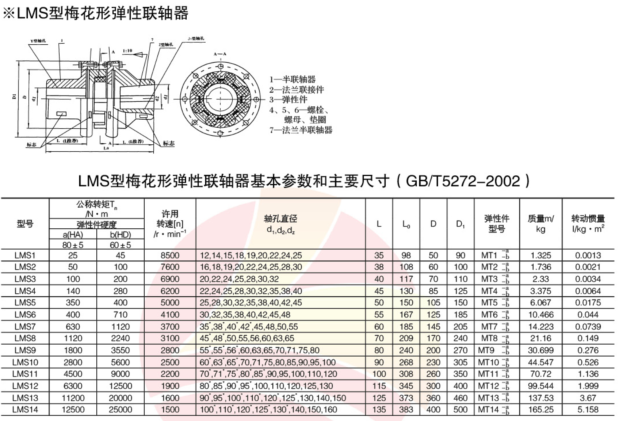MLS(LMS)梅花弹性联轴器 特点及应用场合:具有补偿两轴相对偏移、减振、缓冲性能、径向尺寸小,结构简单、不用润滑、承载能力较高,维护方使、更换弹性元件需轴向移动 (MLS型除外),适用于联接同轴线,起动频繁,正反转变化,中速、中等转矩传动轴系和要求工作可靠性高的工作部位。不适用于重载、低速及轴向尺寸受艰制,更换弹性元件后两轴对中困难的部位。