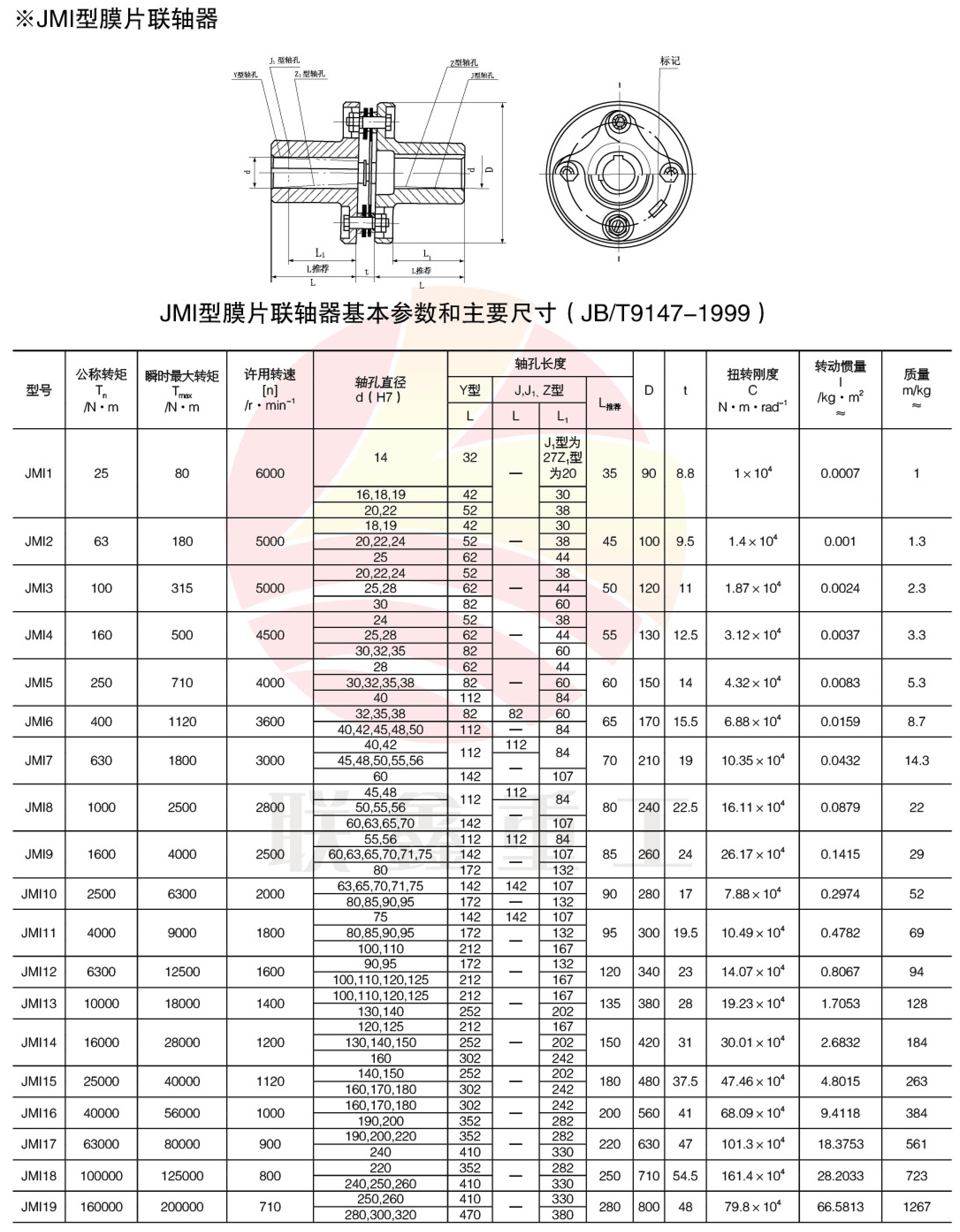 JMI型膜片联轴器 特点及应用场合:与金属弹性元件挠性联轴器相比,具有机械强度高,承载能力大、质量轻结构尺寸小、传动效率和传动精度高,可靠性好、装拆方便等特点。适用于中、高速、大转矩轴系传动。与鼓形齿式联轴器相比,具有无相对滑动,不需润滑,使用寿命长、无噪声、结构简单等特点.可部分代替鼓形齿式联辅器。不受温度和油污影响。具有耐酸、碱,防腐蚀的特点。可用于高温、低温和有油、有水和腐蚀介质的工况环境.适用于各种机械装置载荷变化不大的轴系传动,通用性极强,工业发达国家已普遍采用,是我国重点推广应用的高性能挠性联轴嚣,高精度膜片联轴器可用于高速工况。膜片联轴器与齿式联轴器相比,没有相对滑动,不需要润滑、密封,无噪声,基本不用维修,制造较方便,可部分代替齿式联轴器。膜片联轴器在工业发达国家应用已很普遍,在实际应用中一般采用接中间轴型,以提高两轴线偏移补偿性能。