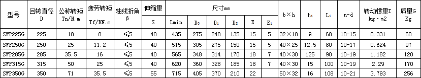 SWP-G型万向联轴器 特点及应用场合:轴承是易损件.为便于更换轴承,将轴承座压盖作成剖分式,螺栓联接,可在β≤5°~10°工况下工作。适用于轧钢机械、起重运输机械、工程机械、矿山机械、石油机械及其他重型机械,联接两个不同轴线的轴系传动,不能缓冲、减振。